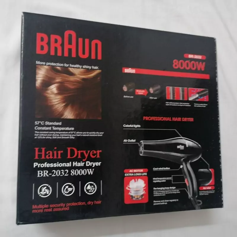 سشوار حرفه ای براوون موتور سنگین made in taiwan  braun made in taiwan سشوار بسیار زیبا با دو سرعت باد سرد  و  دو سرعت باد گرم و دارای سری متمرکز کننده باد و کابل بلند مناسب برای استفاده حرفه ای و سالنی بسیار حرفه ای و پرتاب باد زیاد و حرارت قوی  موتور بزرگ AC دارای دکمه کم و زیاد مجزا برای پرتاب باد  و حرارت دارای 1 عدد سری باد جمع کن دارای دکمه سرد فوری  بسیار شیک و حرفه ای (با توجه به عکس ها برند braun روی سشوار کمی پاکشدگی دارد)  made in taiwan سشوار 7000 وات براوون با ساختار زیبا دارای ویژگی هایی است که این محصول را نسبت به بسیاری از محصولات دیگر متمایز میکند. سشوار مجهز به فیلتر دائمی قابل شستشو است که از وز کردن و شکستن موها جلوگیری میکند و میتوان بعد از مدتی استفاده از سشوار، فیلتر را خارج نموده و شستشو داد، دارای قابلیت تنظیم برای 3 دما و 2 شدت جریان متفاوت برای خشک کردن و مدل دادن به مو است. از ویژگی های سشوار مجهز بودن به دکمه خنک کننده است که جهت مدل دادن به کار میرود.