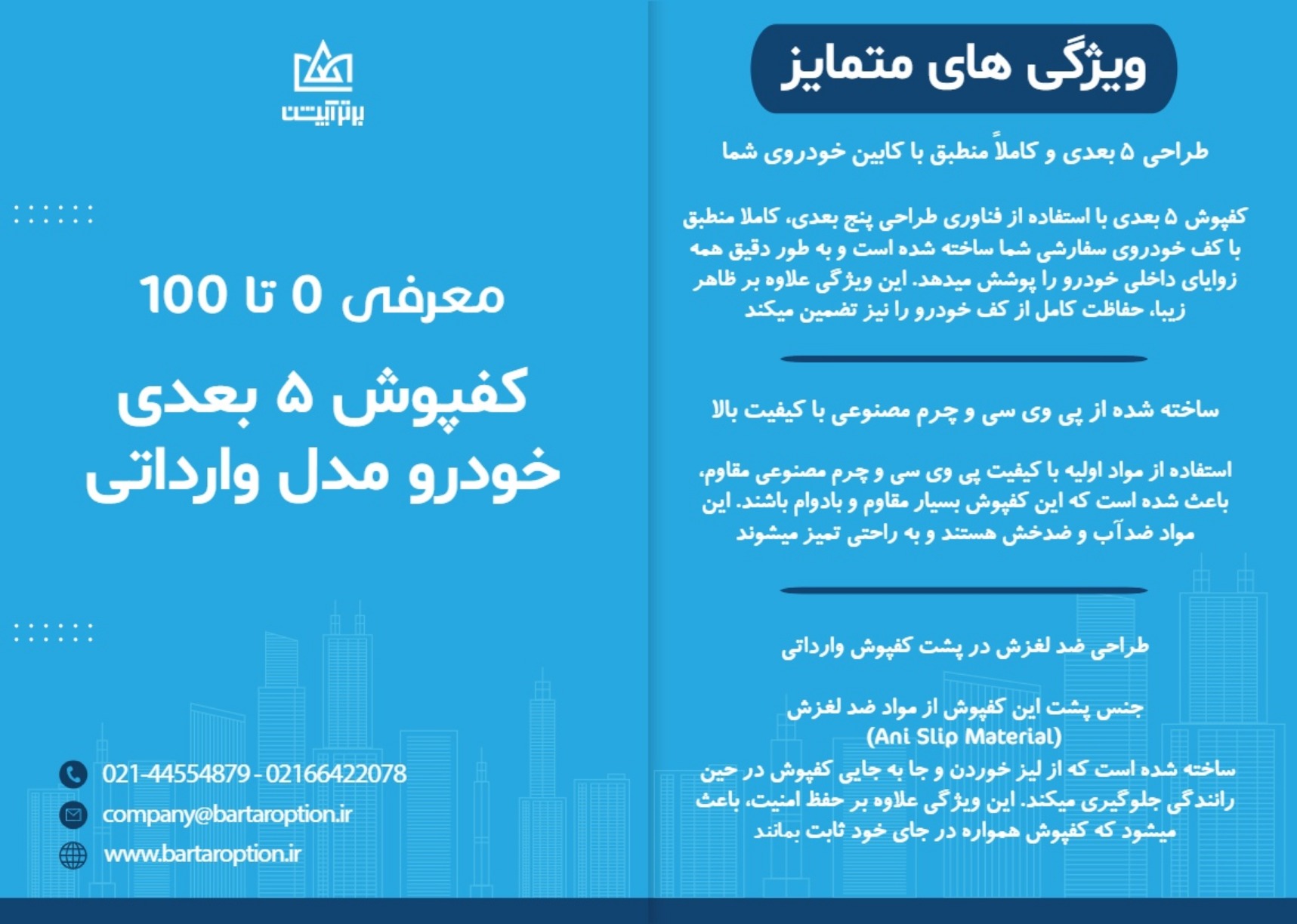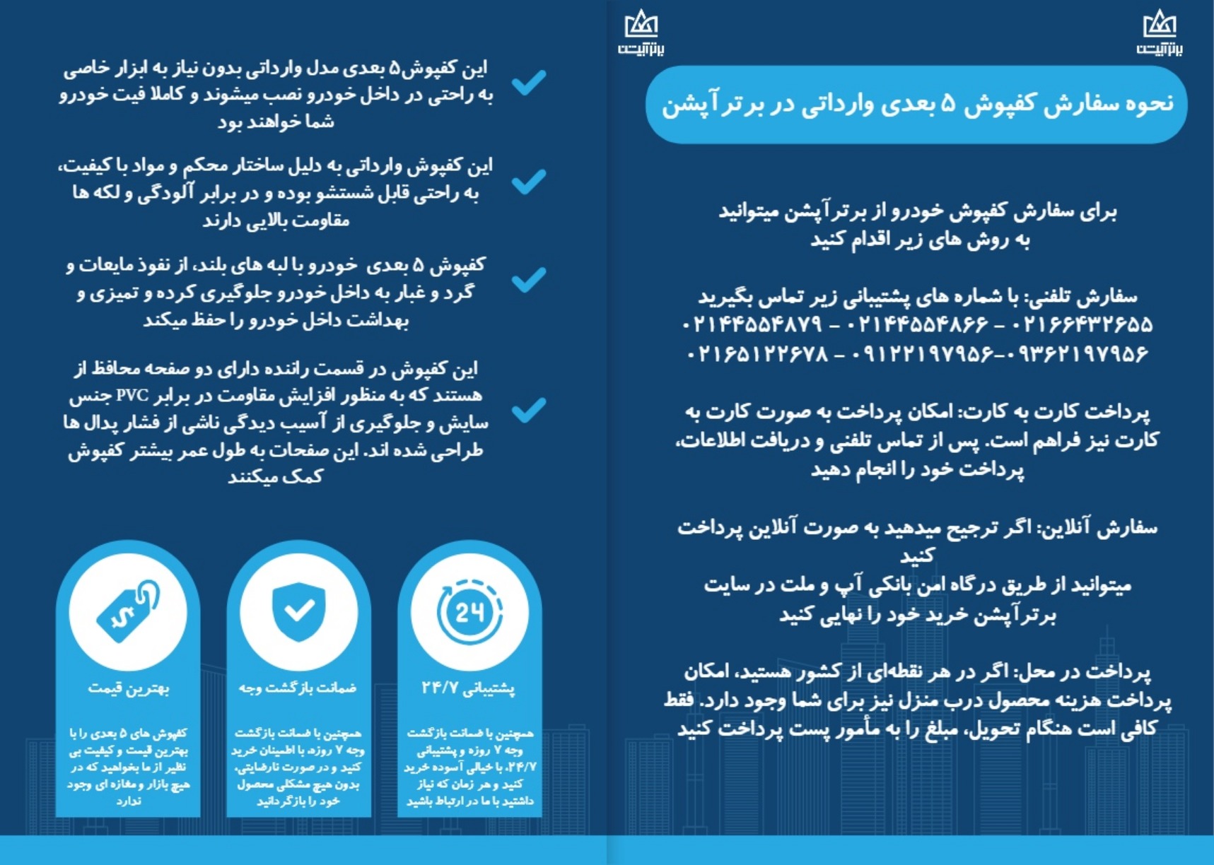 ضمانت سایز و ابعاد فابریک: اگر کفپوش دقیقاً اندازه و قالب خودروی شما نبود، ما با هزینه خودمان آن را تعویض میکنیم.